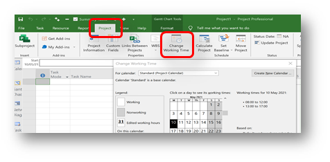 Make sure you update your Project Calendar as well as individual Resource Calendars prior to finalising your plan. To do this, select “Project” Tab on the ribbon and then chose “Change Working Time”