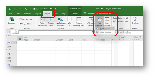 To set your Baseline, select the “Project” Tab on the ribbon and then chose “Set Baseline”. You can view your baseline on the Gantt Chart or insert the Baseline columns.