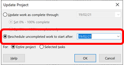 Using the dialogue box, chose Reschedule uncompleted work to start after and chose your date (this will default to your status date)
