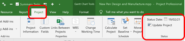 Once you have inputted all of your % complete using the method above, using the Project Tab on the Ribbon, in the Status group, chose Update Project